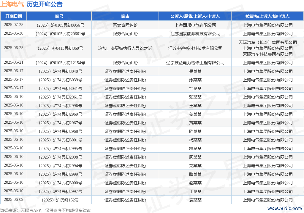 案号:(2024)沪0105民初12154号审理法院:上海市长宁区人民法院案由:服务合同纠纷当事人信息: 原告/上诉人:辽宁技益电力检修工程有限公司 被告/被上诉人:上海电气集团股份有限公司开庭日期:2025年6月21日根据统计,近一年内以上海电气集团股份有限公司为当事人的历史开庭公告有505则,其中案由为“证券虚假陈述责任纠纷”的公告以471则居首,其次为“买卖合同纠纷”有10则,“股票权利确认纠纷”有5则。历史开庭公告(前20条)如下: